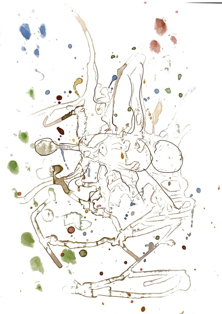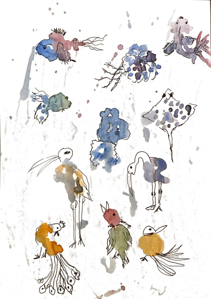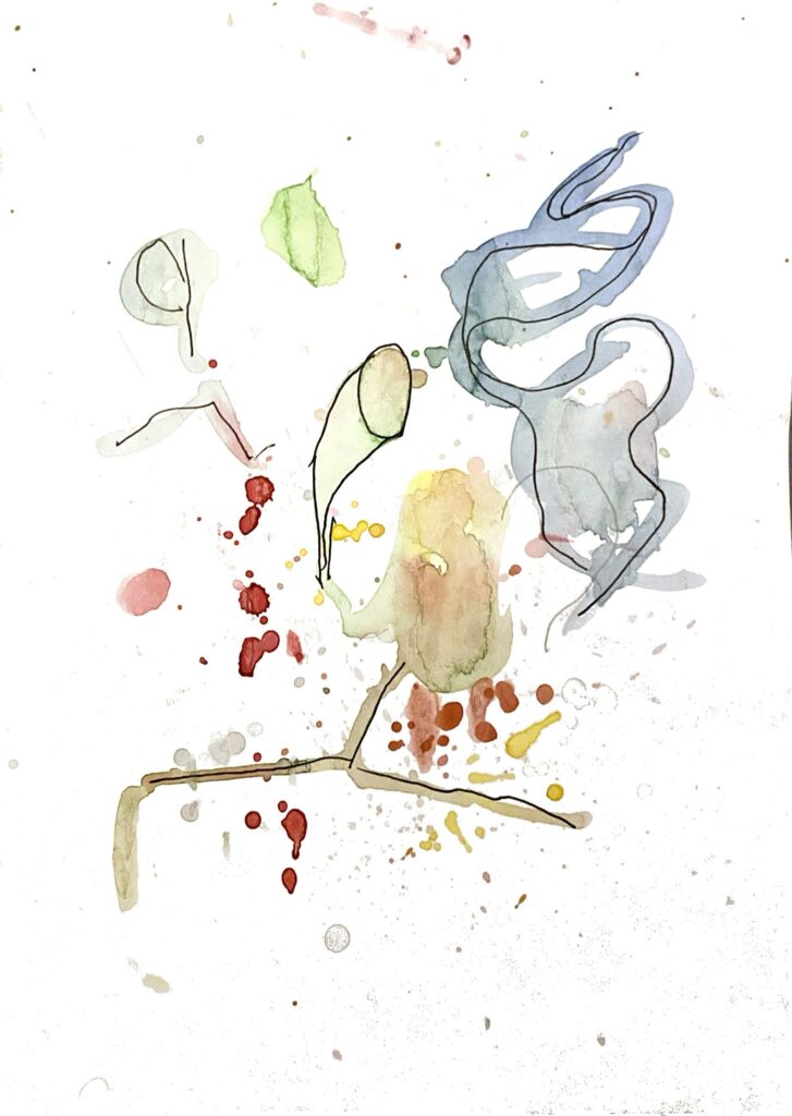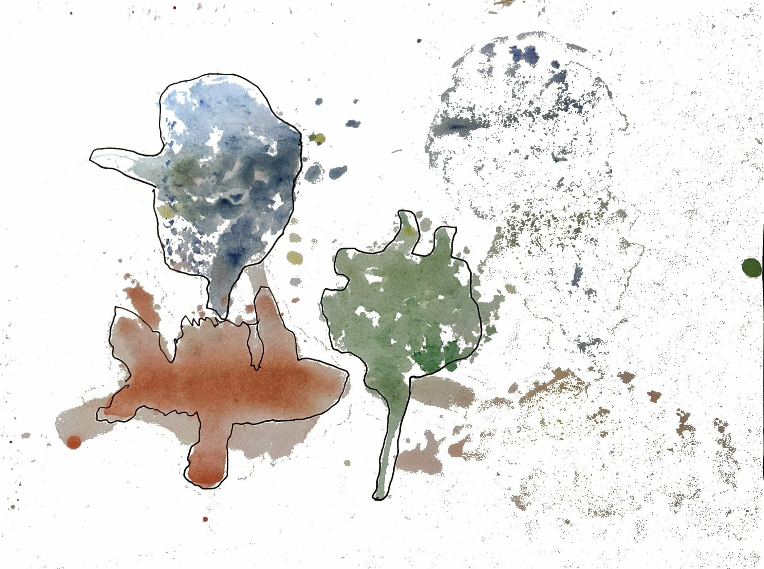Hier arbeiteten wir mit Pinsel und Wasserfarbe und probierten uns an Spritztechniken, der Fingerabdruck-Technik, sowie der Abklatschtechnik – um final die entstandenen Formen und Farben „auszudeuten“. Das bedeutet, wir wurden Kunstforscher*innen und suchten in den Bildern nach Bekanntem, obwohl nichts mit Absicht entstanden war. „Verboten“ war es direkt zu malen / Formen zu zeichnen – nur der Zufall sollte unsere Werke entstehen lassen.